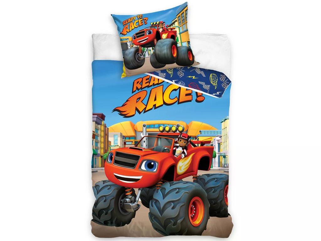 Povlečení má oboustranný potisk – každá strana má jiný motiv, díky tomu můžete snadno měnit vzhled postele podle nálady. Na přední straně povlečení je dominantou červený monster truck Plamínek, v kabině sedí usměvavý řidič AJ, připravený na start závodu. Na zadní straně jsou po celé ploše rozmístěny menší motivy typické pro svět závodů.