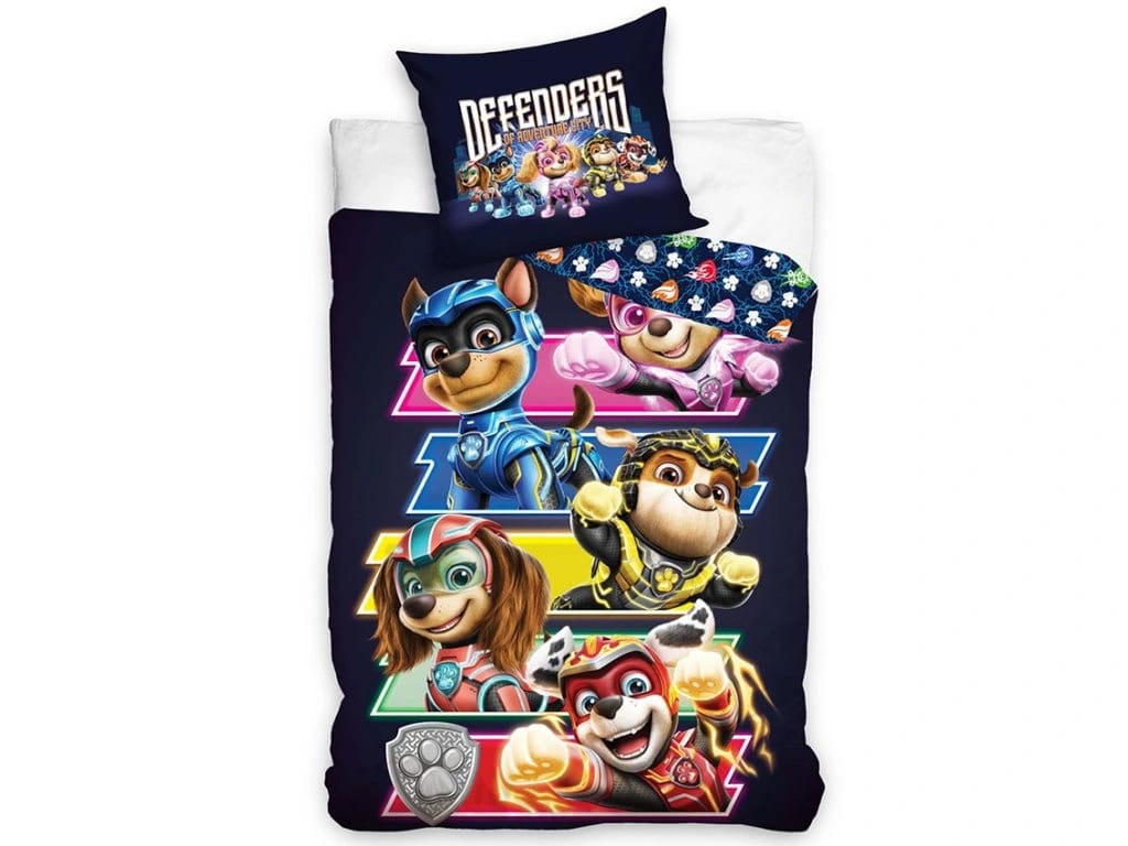 Supertlapky Chase, Skye, Liberty, Rubble a Marshall společně běží vstříc novým dobrodružstvím. Rubová strana povlečení je tmavě modrá a jsou na ní barevné obrázky mocných, psích odznáčků. Povlak polštáře je z obou stran stejný a je něm super mocné tlapky, prostě Supertlapky.
