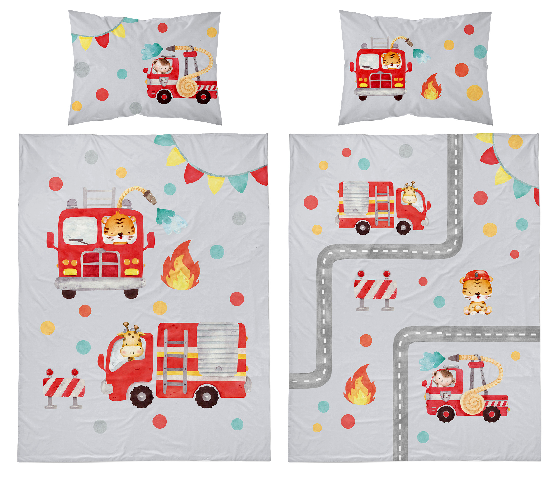 Povlečení má oboustranný potisk – každá strana má jiný motiv, díky tomu můžete snadno měnit vzhled postele podle nálady. Na přední straně povlečení jsou hasičská auta se zvířátky. Zadní strana je také šedá s hasičskými auty.