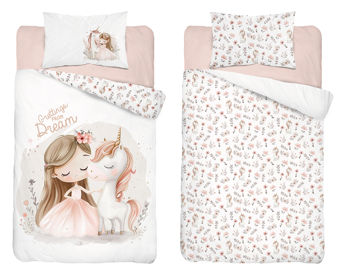 Povlečení má oboustranný potisk – každá strana má jiný motiv, díky tomu můžete snadno měnit vzhled postele podle nálady. Na přední straně povlečení je něžná ilustrace holčičky v růžových šatech objímající bílého jednorožce. Zadní strana je zdobena drobným opakujícím se vzorem jednorožců, květin a lístků v jemných růžových a šedých tónech.