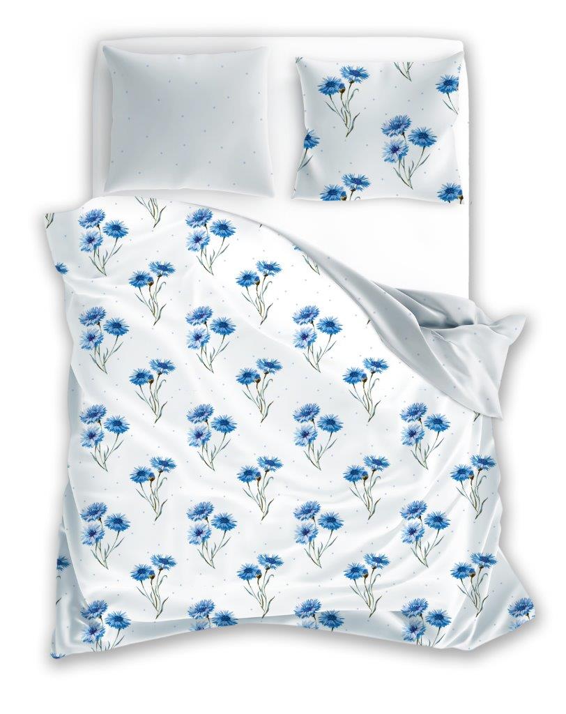 Povlečení s modrými chrpami je v rozměru 140×200 a 70×90 cm v moderním designu. Na přední straně ložního povlečení na bílém podkladu jsou hlavním motivem modré chrpy. Opačná strana povlečení je bílá s modrými puntíky. Povlak polštáře je také oboustranný a svou barvou a vzorem je shodný s povlakem přikrývky. Povlak na přikrývku a polštář je opatřen zipem. Kvalitní bavlna je velice hebká a příjemná na dotek. To se týká jak pevnosti látky, tak její odolnosti vůči následnému praní, díky čemuž povlečení nevybledne a barvy si zachovají svou barvu. Pokud k tomu přidáme zapínání na zip a použití originálního designu, dostaneme produkt, který splní očekávání i těch nejnáročnějších zákazníků.