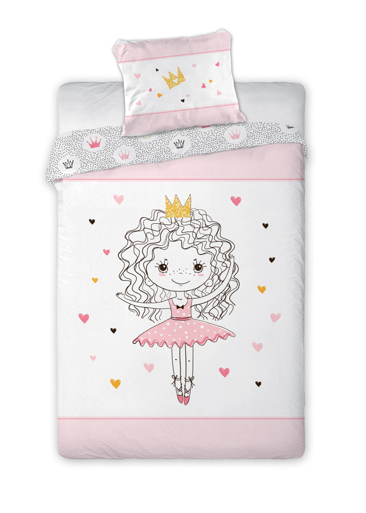 Povlečení má oboustranný potisk – každá strana má jiný motiv, díky tomu můžete snadno měnit vzhled postele podle nálady. Na přední straně se pyšní výrazný motiv tančící princezny na baletních špičkách. Zadní stranu zdobí menší obrázky princeznovských korunek.