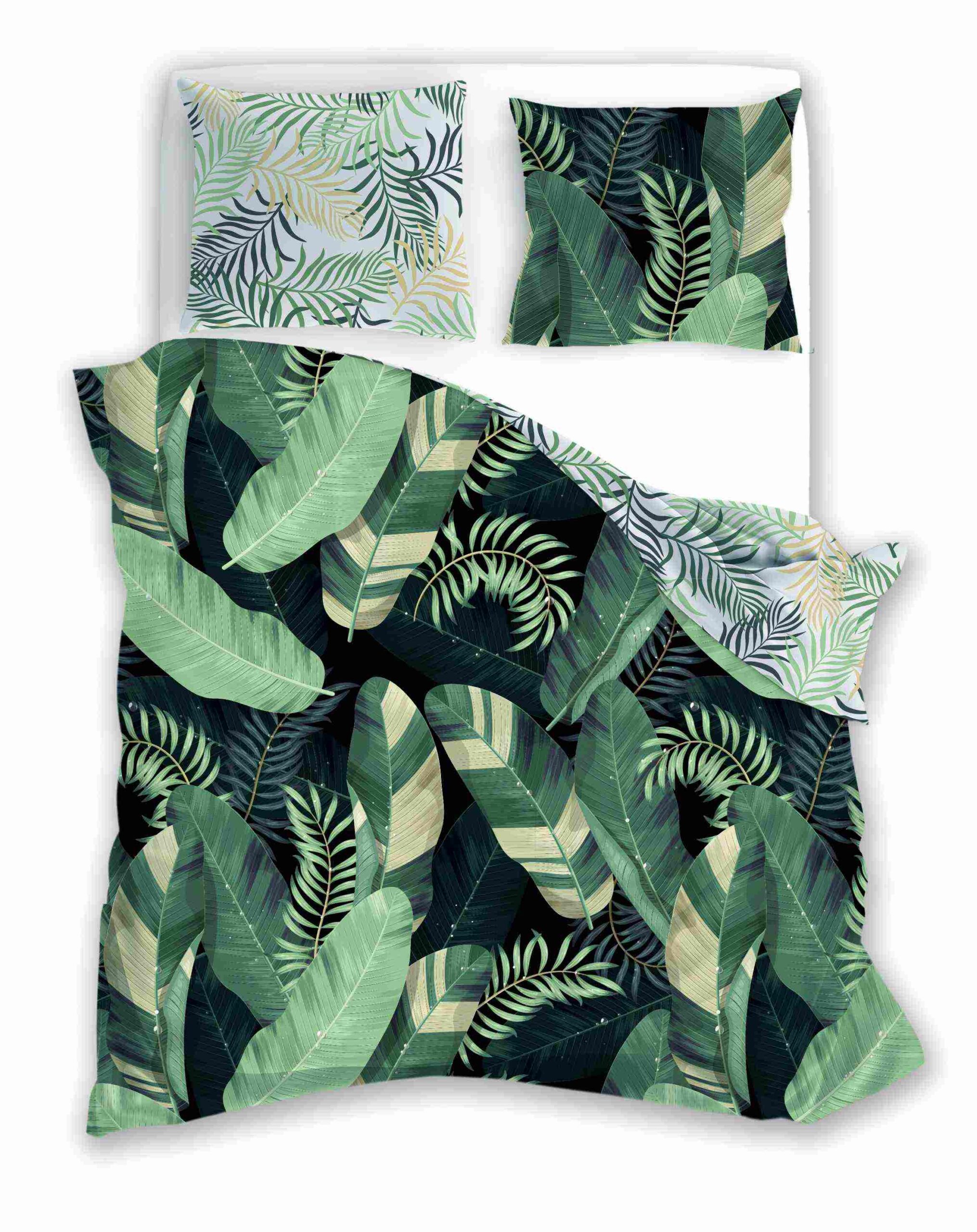 Povlečení s listy je v rozměru 140×200 a 70×90 cm v moderním designu. Na přední straně ložního povlečení na tmavém podkladu jsou různé tvary listů, které hrají všemi barvami zelené. Opačná strana povlečení je bílá s listy kapradin. Povlak polštáře je také oboustranný a svou barvou a vzorem je shodný s povlakem přikrývky. Povlak na přikrývku a polštář je opatřen zipem. Kvalitní bavlna je velice hebká a příjemná na dotek. To se týká jak pevnosti látky, tak její odolnosti vůči následnému praní, díky čemuž povlečení nevybledne a barvy si zachovají svou barvu. Pokud k tomu přidáme zapínání na zip a použití originálního designu, dostaneme produkt, který splní očekávání i těch nejnáročnějších zákazníků.