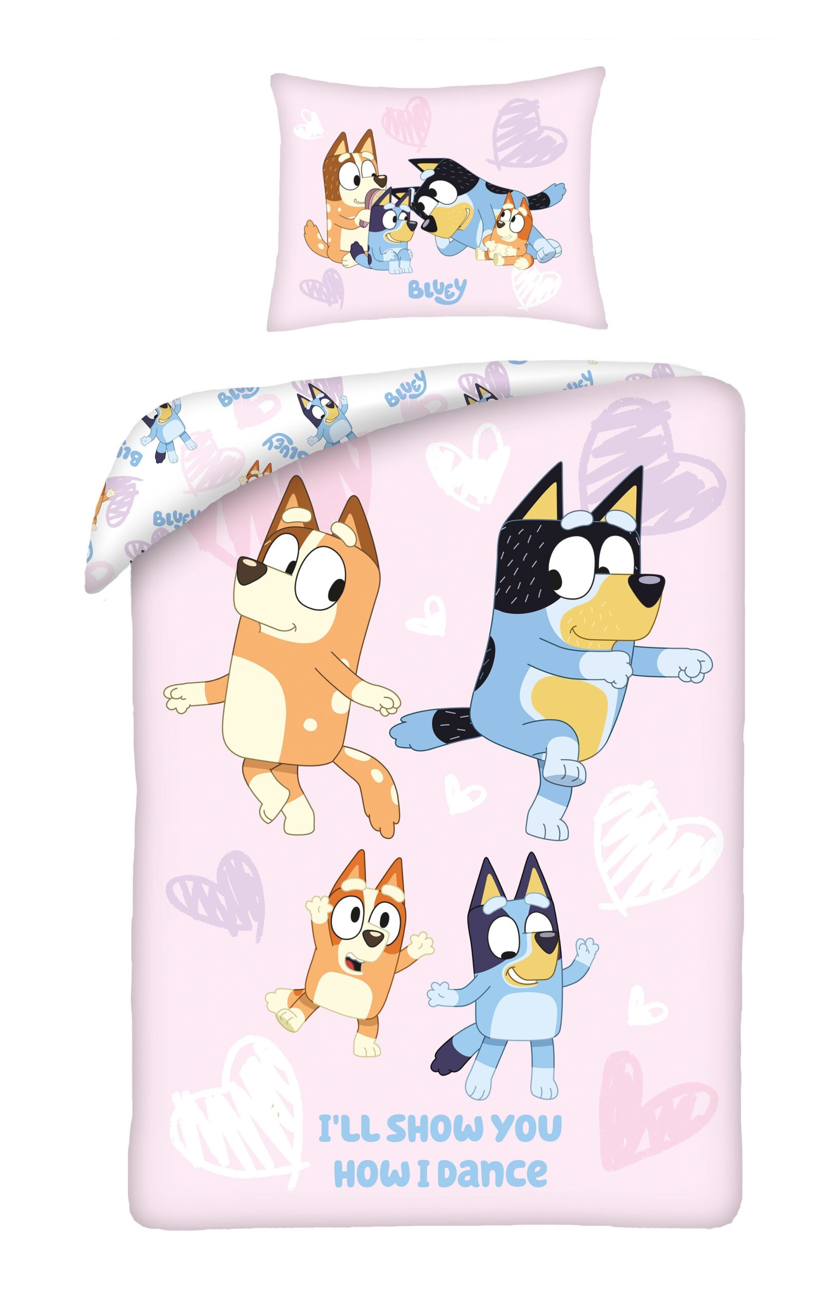 Povlečení má oboustranný potisk – každá strana má jiný motiv, díky tomu můžete snadno měnit vzhled postele podle nálady. Na přední straně povlečení je velký obrázek, na kterém Bluey a jeho rodina tančí. Zadní stranu zdobí drobné motivy tancující rodiny Blueyho.