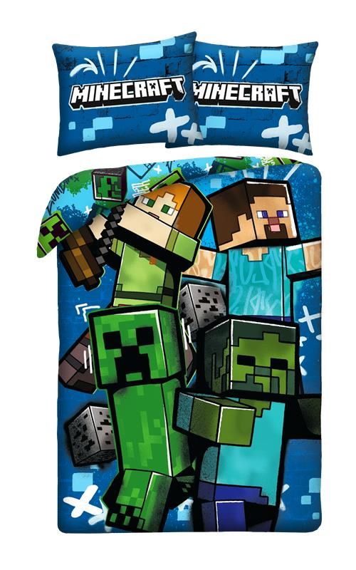 Povlečení má oboustranný potisk – každá strana má jiný motiv, díky tomu můžete snadno měnit vzhled postele podle nálady. Na přední straně povlečení dominuje velký motiv se Steevem, Alex, Creeperem a zombie. Zadní strana je poseta drobnými obrázky z Minecraftu.