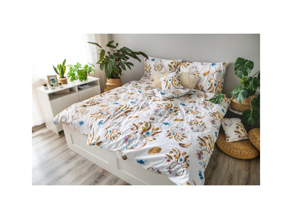 Bílé povlečení se vzorem lapačů snů pro klidný spánek. Kvalitní bavlna je velice hebká a příjemná na dotek. Na bílém povlaku přikrývky jsou lapače snů v různých velikostech a různá peříčka, která doplňují celkový design tohoto povlečení pro klidný spánek. Tento vzor se objevuje i na povlaku polštáře v rozměru 70×90 cm a na polštářku. Povlečení je ve standardním rozměru 140×200 a 70x 90 cm. K tomu nabízíme ještě povlak na polštářek ve velikosti 40×40 cm. Výplň do tohoto povláčku najdete také na našem e-shopu. Díky zapínání na zip bude povlékání snadnější.