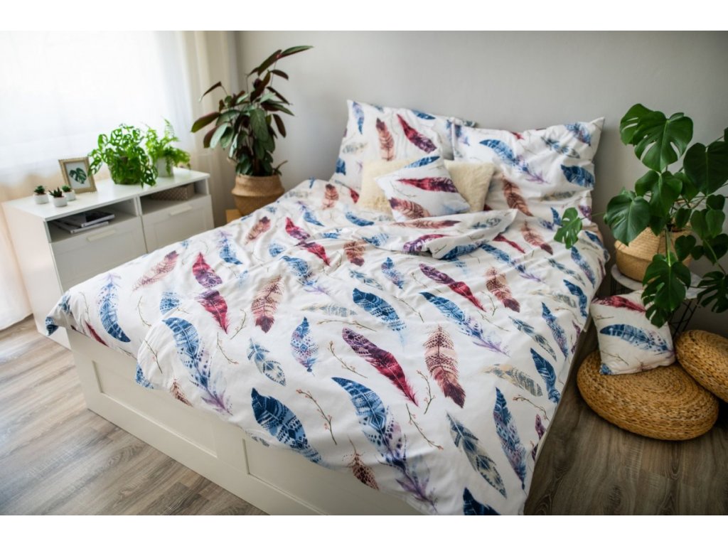 Bílé povlečení se vzorem barevných peříček. Tento vzor se objevuje i na povlaku polštáře v rozměru 70×90 cm a na polštářku. Kvalitní bavlna je velice hebká a příjemná na dotek. Povlečení je ve standardním rozměru 140×200 a 70x 90 cm. K tomu nabízíme ještě povlak na polštářek ve velikosti 40×40 cm. Výplň do tohoto povláčku najdete také na našem e-shopu. Díky zapínání na zip bude povlékání snadnější.