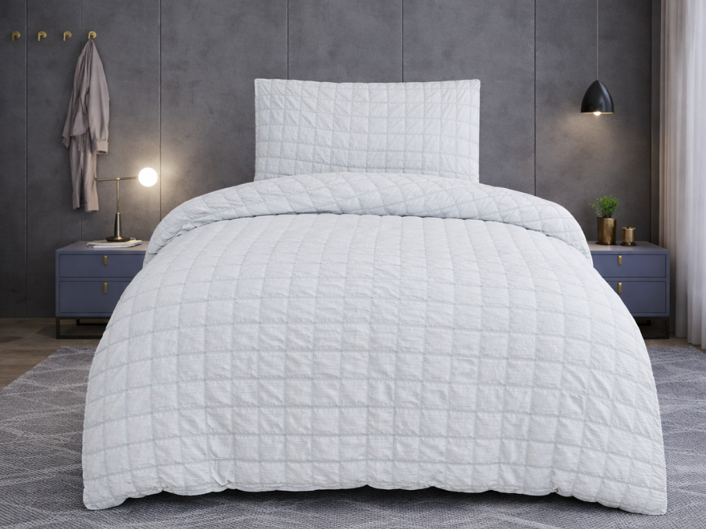 Krepové povlečení s jemným kostičkovým vzorem, který vytváří zajímavou strukturu na povrchu látky. Krepový materiál má typickou lehce zvlněnou texturu, která povlečení dodává lehkost a vzdušnost. Povlak na polštář a přikrývku je sladěn do stejného designu, který dodává celkovému vzhledu jednotnost a harmonii. Povlečení působí velmi decentně, což se dobře hodí do minimalistických a moderních interiérů.