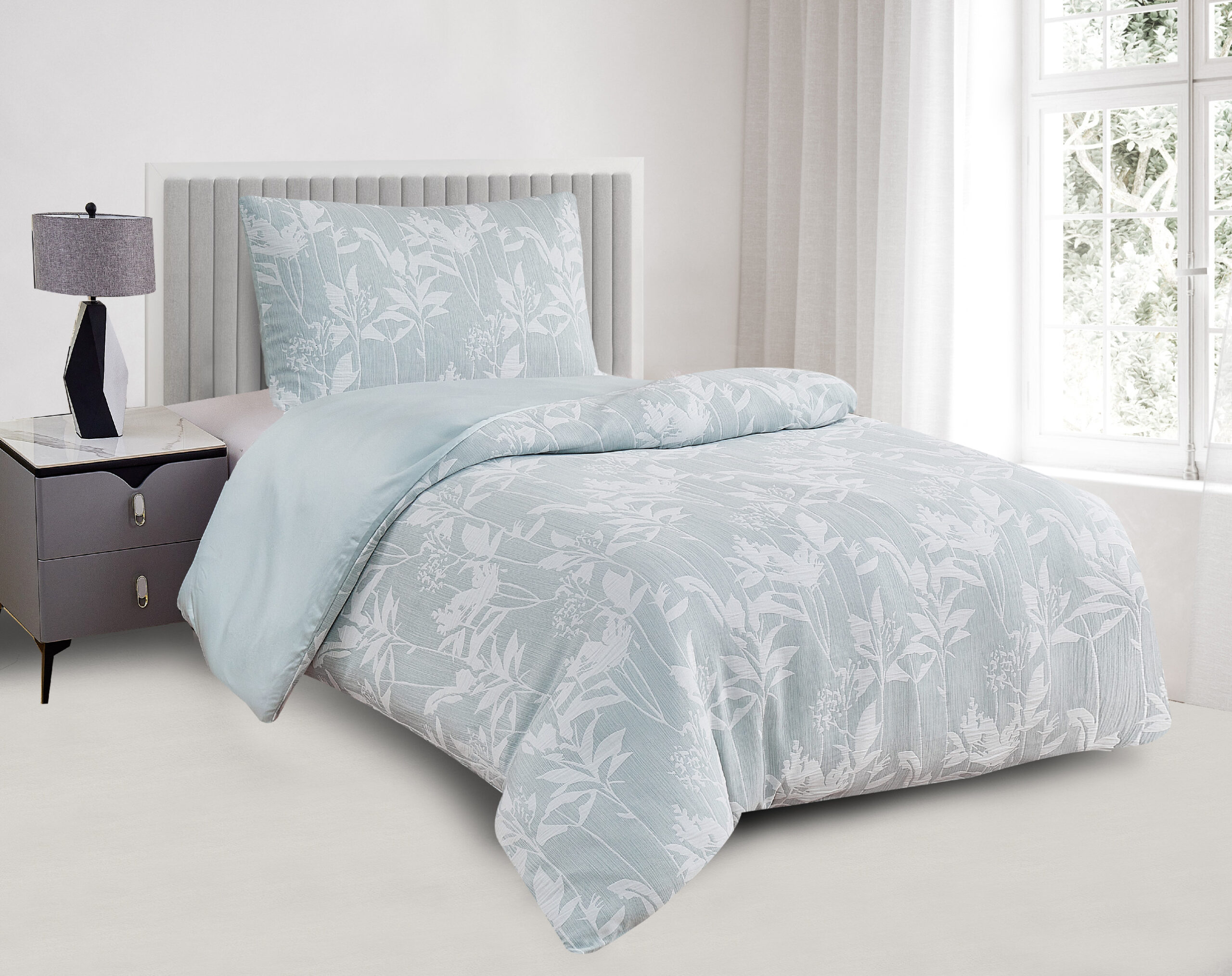 Z druhé strany odolný žakár s tkaným rostlinným vzorem – pevný, elegantní. Díky tomu, že vzor není potištěný, ale je vpletený přímo do látky speciální technikou, je povlečení odolnější vůči opotřebení a zachová si svůj vzhled i po mnoha praních.