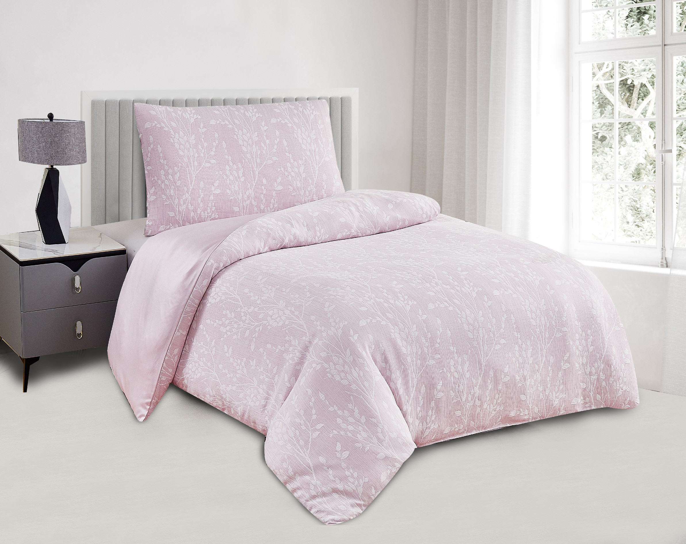 Z druhé strany odolný žakár s tkaným rostlinným vzorem – pevný, elegantní. Díky tomu, že vzor není potištěný, ale je vpletený přímo do látky speciální technikou, je povlečení odolnější vůči opotřebení a zachová si svůj vzhled i po mnoha praních.