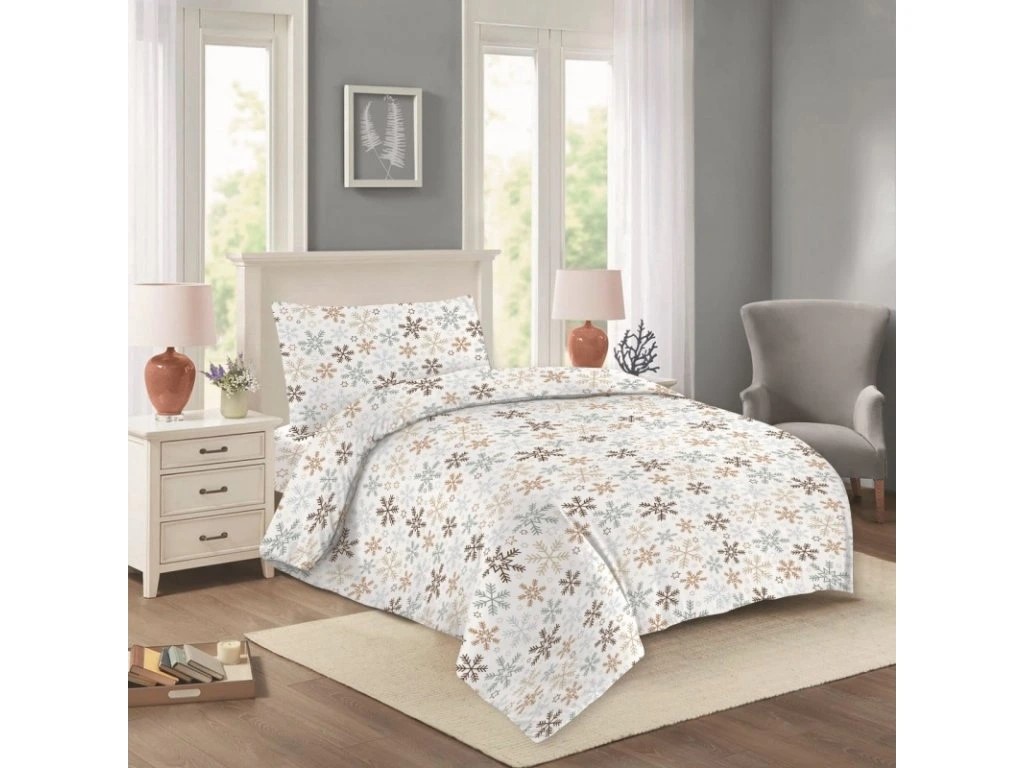 Povlečení má oboustranný potisk – každá strana má jiný motiv, díky tomu můžete snadno měnit vzhled postele podle nálady. Přední strana povlečení je bílá s motivem šedých a hnědých sněhových vloček. Zadní strana má stejný motiv.
