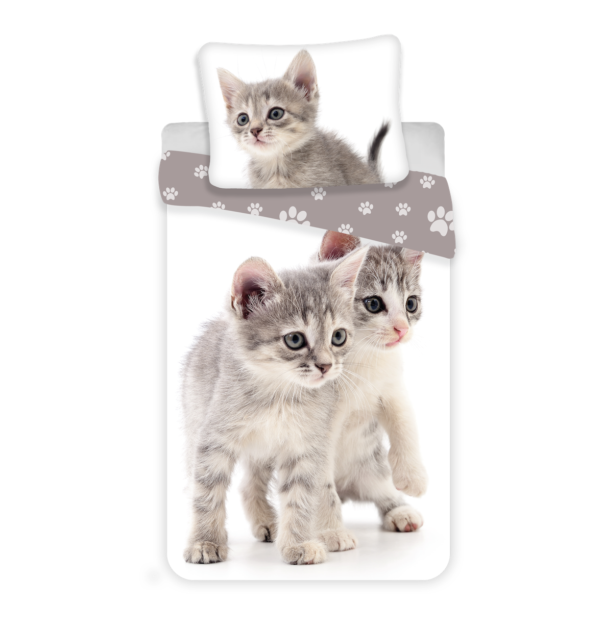 Bavlněné povlečení s potiskem kočiček Kitten Grey, oblíbené zvířátko všech holčiček i kluků. Povlečení je vyrobeno ze 100% bavlny, která je zárukou klidného spánku po celou noc. Bavlna se vyznačuje vysokou savostí a příjemnou jemností k dětské pokožce. Bavlněné povlečení je opatřeno zipem a je ve standardním rozměru 140×200 cm.