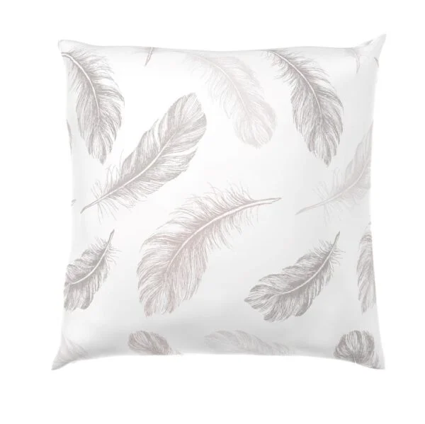 Bavlněný povlak na polštářek Shelby – bílá zdobí tmavá a světlá béžová peříčka na bílém podkladu.
