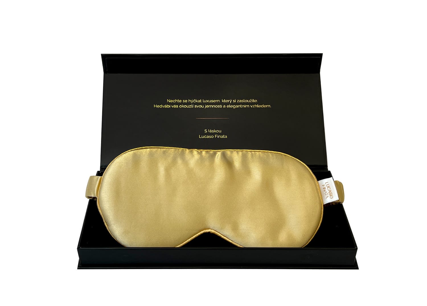 Hedvábná maska na spaní v odstínu Royal gold je jemná jako polibek na dobrou noc. Přinese vám klidné a světlem nerušené sny. Maska je vyrobena z vysoce kvalitního přírodního 100% morušového hedvábí.