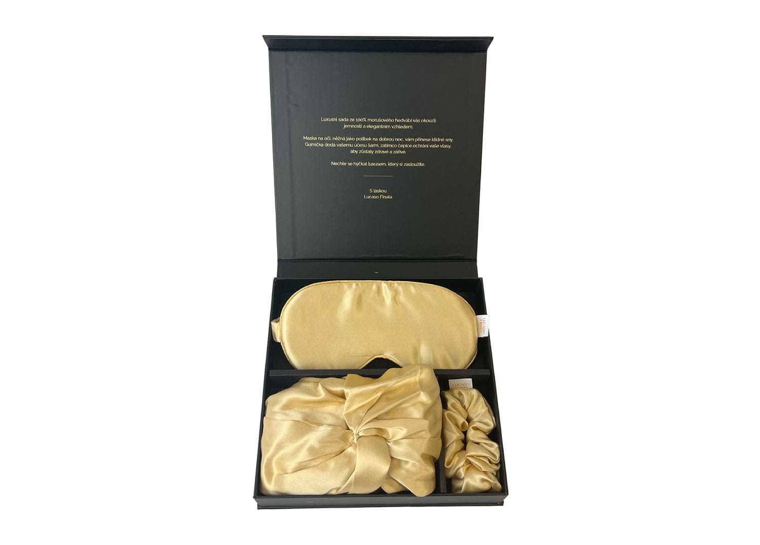 Prémiová hedvábná dárková sada v odstínu Royal gold s čepicí na spaní, maskou na spaní a gumičkou luxusní značky Lucaso Finata.