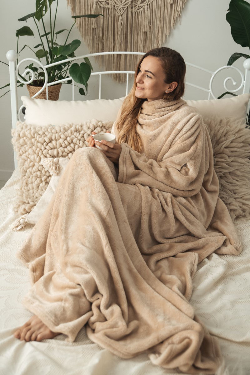 Velmi příjemná heboučká deka z mikroplyše v béžové barvě barvě. Velkou výhodou této deky jsou rukávy, které jsou praktické při čtení knihy nebo práci na notebooku. Deka je vyrobená ze 100% polyesteru v rozměru 150×210 cm. Gramáž této deky je 320 g/m2. Její povrch je velmi jemný a příjemný na omak. Ani po několika vypráních nemění barvu a nežmolkuje, je odolná vůči pomačkání, a stále si udržuje svůj tvar a vzhled. Mikroplyšový materiál má jemný a sametový vzhled s krátkými vlákny, které vypadají jako korálové útesy, odtud pochází jeho název. Pokud jde o teplo, plyšové deky zadržují teplo a tvoří izolační vrstvu, což znamená, že udržují teplo blízko vašeho těla.