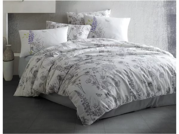 Bílé povlečení s jemnými květinovými vzory osloví každého, kdo má rád květiny. Kvalitní bavlna Renforce je velice hebká a příjemná na dotek a oproti klasické bavlně je méně mačkavá. Na povlaku přikrývky jsou z obou stran šedé luční kvítky a motýlci. Tento vzor se objevuje i na povlaku polštáře v rozměru 70×90 cm.