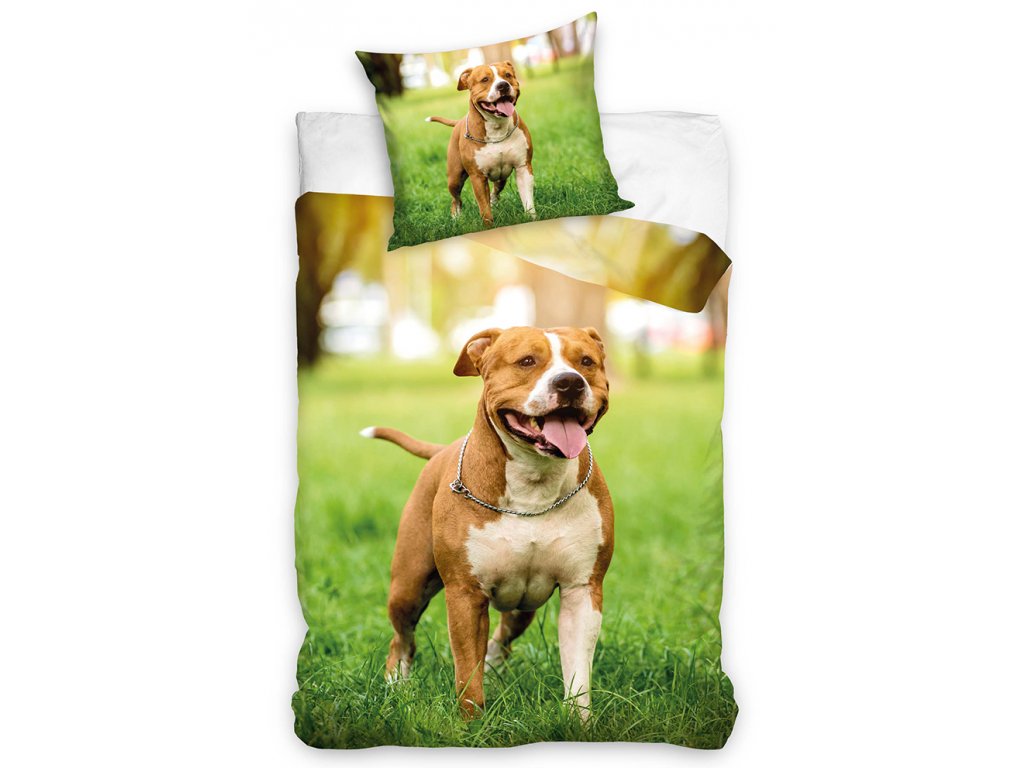Bavlněné povlečené s potiskem roztomilých zvířátek bude krásným doplňkem dětské postele. Nádherné realistické provedení povlečení ze 100% bavlny se zaručuje dlouhou životností, navíc je bavlněné povlečení krásně jemné a hebké k pokožce. Přední i zadní strana přikrývky je obrázkem shodná, povlečení je tedy z obou stran stejné. Ačkoliv se Staford na první pohled nemusí zdát, je to pes vhodný k dětem i do bytu. Tento pejsek je velmi pohyblivý a čilý a neobyčejně zvídavý ke svému okolí. Pokud je správně vychován je to veliký mazel, ochranář i osobní strážce. Povlak polštáře je z obou stran stejně laděný jako přední strana povlaku přikrývky. Povlečení je opatřeno praktickým zipovým zapínáním a pyšní se oceněním Öko-Tex Standard 100, které zaručuje stálobarevnost, pevnost tvaru a nulový obsah škodlivých látek.