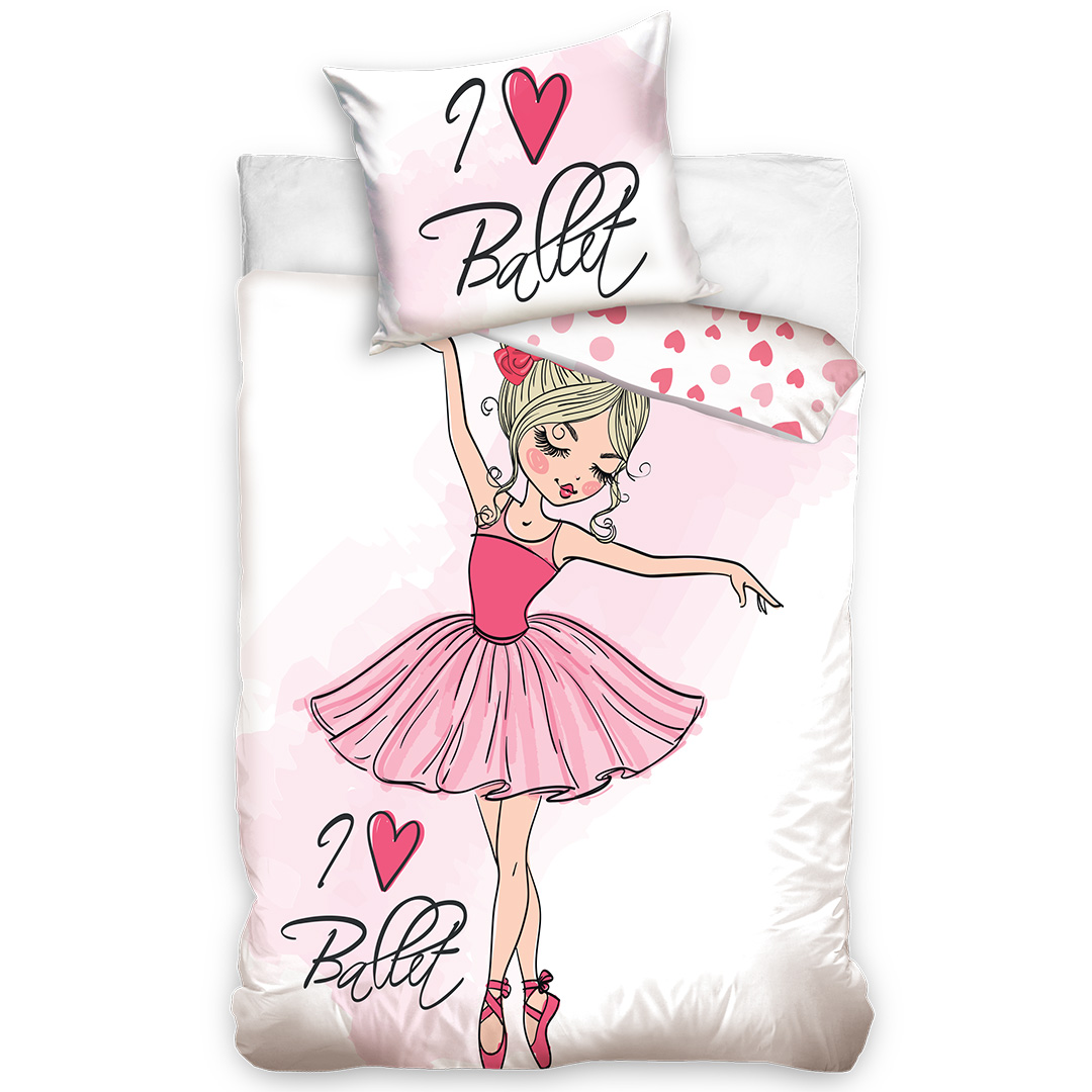 Povlečení má oboustranný potisk – každá strana má jiný motiv, díky tomu můžete snadno měnit vzhled postele podle nálady. Na přední straně je půvabná ilustrace baletky v růžové sukýnce a špičkách. Zadní strana je zdobena drobnými srdíčky a puntíky.