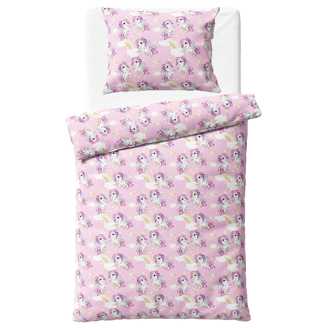 Díky opakujícímu se vzoru, který je stejný na přikrývce i polštáři, působí celý set sladěně a dokonale vyváženě. Jeho půvabný design na jemně růžovém podkladu zachycuje roztomilé jednorožce s duhovými hřívami a ocásky.
