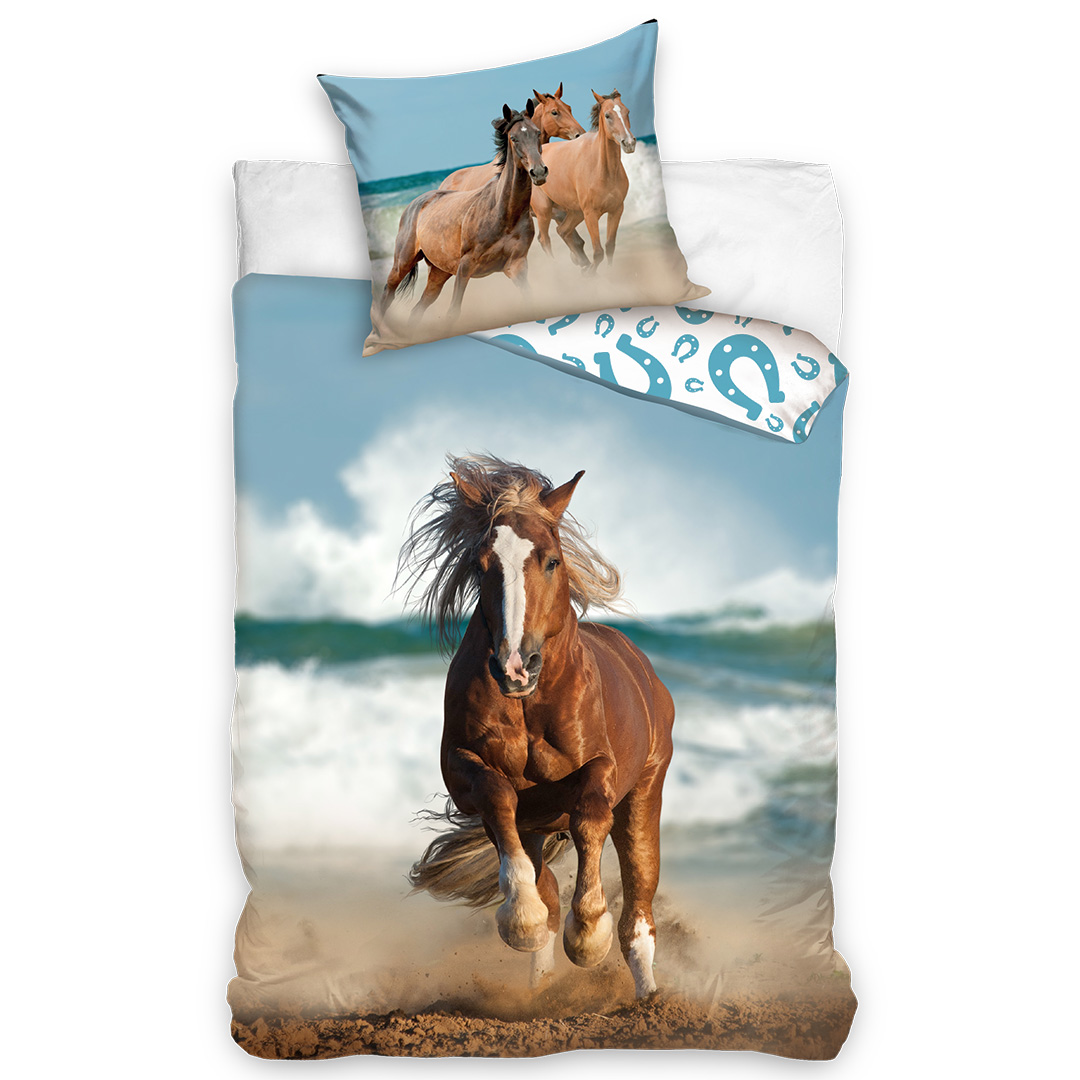 Povlečení má oboustranný potisk – na přední straně přikrývky je dominantní potisk cválajícího hnědého koně, zadní strana přikrývky je laděna do bílé barvy a zdobena motivem modrých podkov.